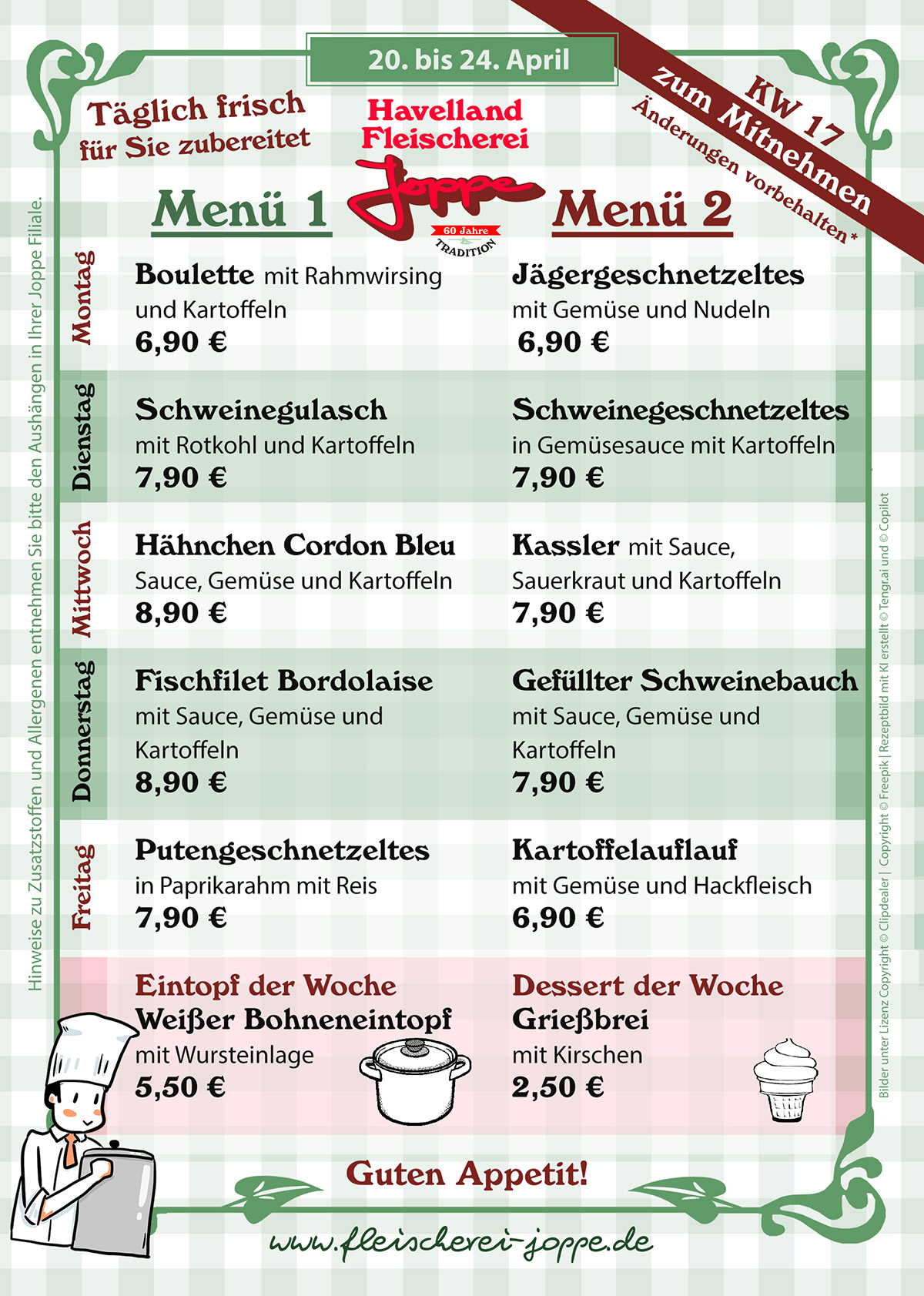 Wir bieten Ihnen täglich frischen und abwechslungsreichen Mittagstisch in unseren Filialen und wünschen Guten Appetit!